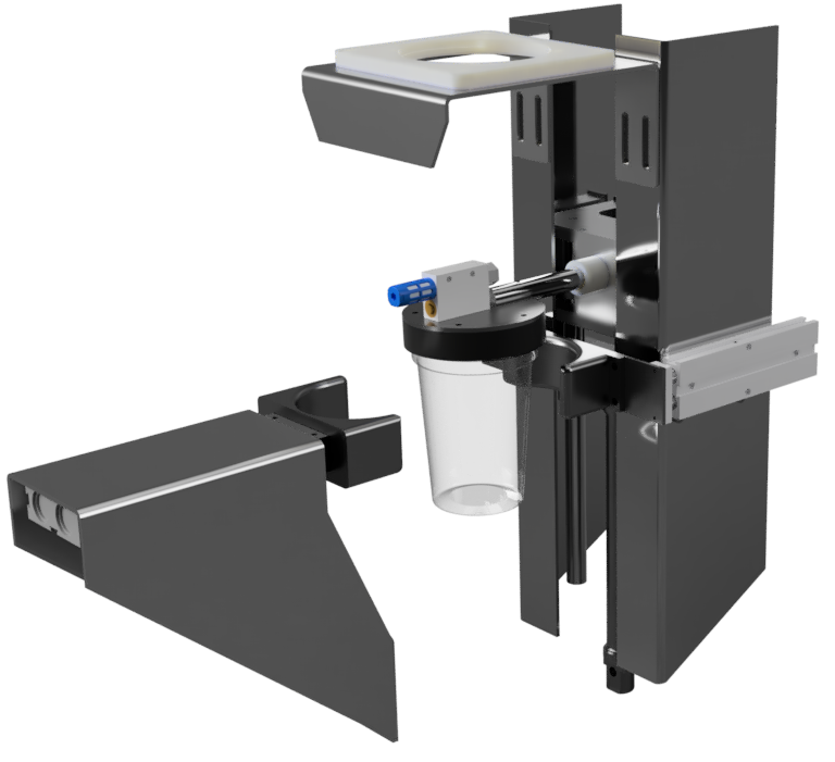 De compacte bouw (voetafdruk van 830 x 750 mm en een hoogte van 1700 mm inclusief veiligheidsscherm) vormde een technische uitdaging. Toch slaagden we erin om een volledig functionele machine te realiseren binnen deze beperkingen.